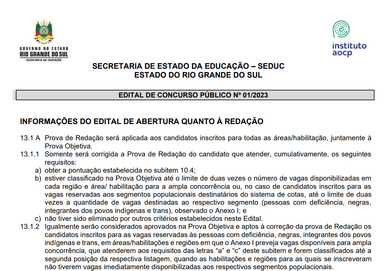 Se você quer subir a sua nota na Redação da AOCP e, com isso, garantir uma melhor colocação nesse concurso da SEDUC – SECRETARIA DE EDUCAÇÃO DO ESTADO DO RIO GRANDE DO SUL – RS, você precisa dominar o Espelho de Correção Divulgado pela AOCP hoje.